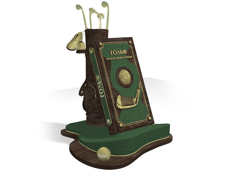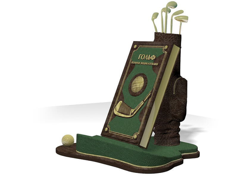The cover of the book is multi-level, decorated with volumetric elements of gilded brass, and decorated with relief gold and deep blind embossing. It is a combination of natural leathers «Country Wood» and «Robbat Verde». The book edge is hand polished and gilded. And the bookstand is made of natural wood, covered with leather in the same style as the book, made in the form of a golf bag.