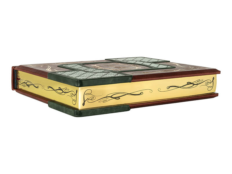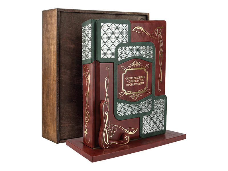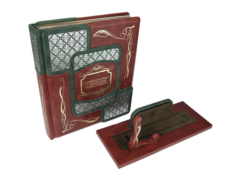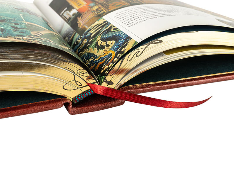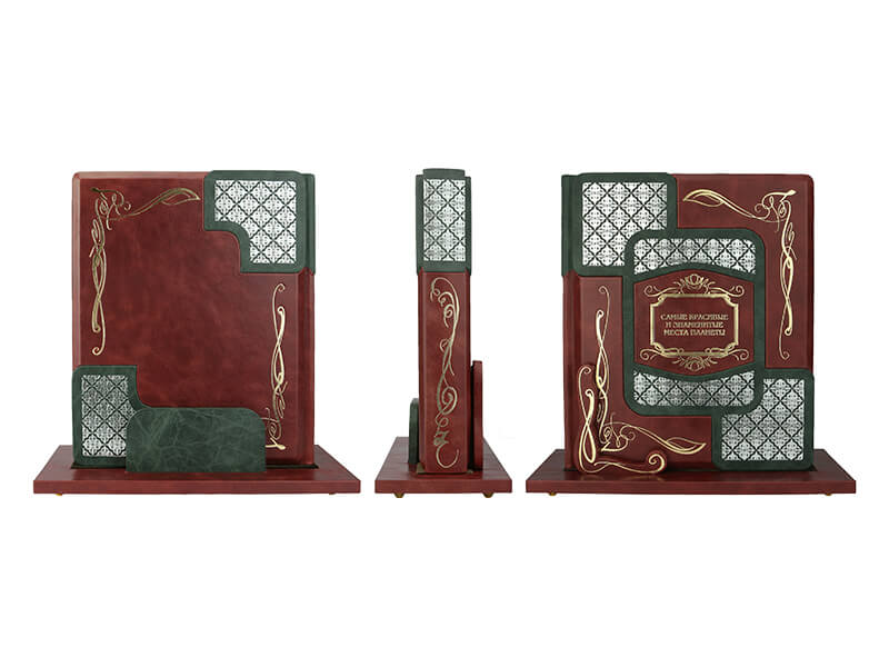 The cover of the book is made of two levels, designed with a combination of gold and red embossing. It contains a fusion of natural leathers «Robbat cognac» and «Robbat parle».